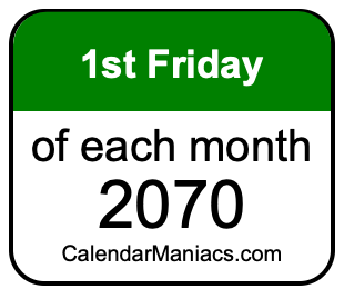 Do you need a list of the first Fridays of each month in 2070? You have come to the right place! We searched through the calendar for 2070 to find the 1st Friday of each month in 2070. Here is the list of the first Fridays of each month in 2070 in the Weekday, Month, Day, Year format: