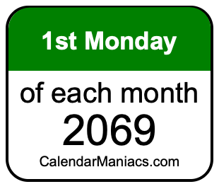 Do you need a list of the first Mondays of each month in 2069? You have come to the right place! We searched through the calendar for 2069 to find the 1st Monday of each month in 2069. Here is the list of the first Mondays of each month in 2069 in the Weekday, Month, Day, Year format:
