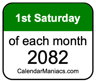 Do you need a list of the first Saturdays of each month in 2082? You have come to the right place! We searched through the calendar for 2082 to find the 1st Saturday of each month in 2082. Here is the list of the first Saturdays of each month in 2082 in the Weekday, Month, Day, Year format: