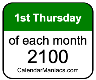 Any finally, for our visitors that use day before month in a date, here is a list of first Thursdays in each month of 2100 in the DD/MM/YY format: