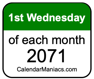 Do you need a list of the first Wednesdays of each month in 2071? You have come to the right place! We searched through the calendar for 2071 to find the 1st Wednesday of each month in 2071. Here is the list of the first Wednesdays of each month in 2071 in the Weekday, Month, Day, Year format: