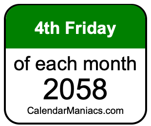 On top of that, for you calendar minimalists, we have also created a list of the 4th Fridays of each month in 2058 in the MM/DD/YY format, as you can see below: