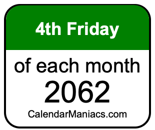 On top of that, for you calendar minimalists, we have also created a list of the 4th Fridays of each month in 2062 in the MM/DD/YY format, as you can see below: