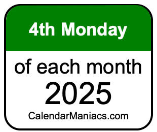 Any finally, for our visitors that use day before month in a date, here is a list of fourth Mondays in each month of 2025 in the DD/MM/YY format: