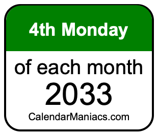 Do you need a list of the fourth Mondays of each month in 2033? You have come to the right place! We searched through the calendar for 2033 to find the 4th Monday of each month in 2033. Here is the list of the fourth Mondays of each month in 2033 in the Weekday, Month, Day, Year format: