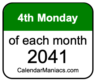 Do you need a list of the fourth Mondays of each month in 2041? You have come to the right place! We searched through the calendar for 2041 to find the 4th Monday of each month in 2041. Here is the list of the fourth Mondays of each month in 2041 in the Weekday, Month, Day, Year format: