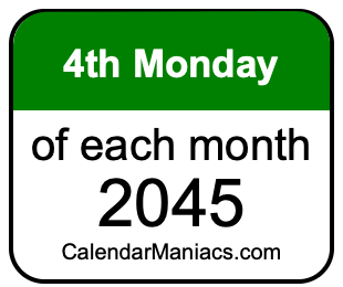 Do you need a list of the fourth Mondays of each month in 2045? You have come to the right place! We searched through the calendar for 2045 to find the 4th Monday of each month in 2045. Here is the list of the fourth Mondays of each month in 2045 in the Weekday, Month, Day, Year format: