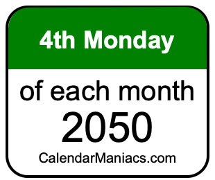 Do you need a list of the fourth Mondays of each month in 2050? You have come to the right place! We searched through the calendar for 2050 to find the 4th Monday of each month in 2050. Here is the list of the fourth Mondays of each month in 2050 in the Weekday, Month, Day, Year format: