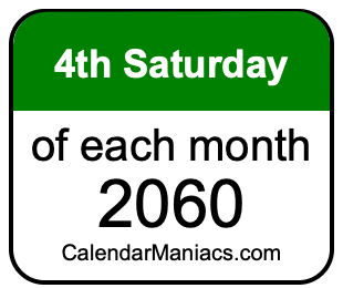 Do you need a list of the fourth Saturdays of each month in 2060? You have come to the right place! We searched through the calendar for 2060 to find the 4th Saturday of each month in 2060. Here is the list of the fourth Saturdays of each month in 2060 in the Weekday, Month, Day, Year format: