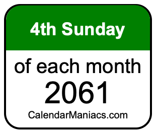 Do you need a list of the fourth Sundays of each month in 2061? You have come to the right place! We searched through the calendar for 2061 to find the 4th Sunday of each month in 2061. Here is the list of the fourth Sundays of each month in 2061 in the Weekday, Month, Day, Year format: