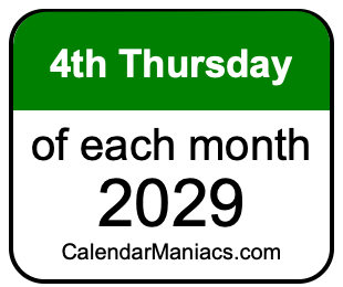 Any finally, for our visitors that use day before month in a date, here is a list of fourth Thursdays in each month of 2029 in the DD/MM/YY format: