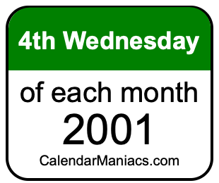 Do you need a list of the fourth Wednesdays of each month in 2001? You have come to the right place! We searched through the calendar for 2001 to find the 4th Wednesday of each month in 2001. Here is the list of the fourth Wednesdays of each month in 2001 in the Weekday, Month, Day, Year format: