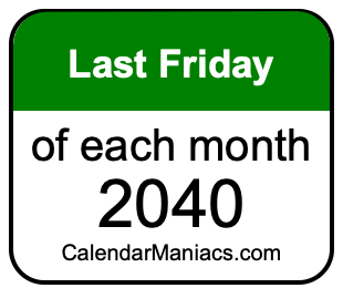 Any finally, for our visitors that use day before month in a date, here is a list of last Fridays in each month of 2040 in the DD/MM/YY format: