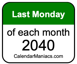 Do you need a list of the last Mondays of each month in 2040? You have come to the right place! We searched through the calendar for 2040 to find the last Monday of each month in 2040. Here is the list of the last Mondays of each month in 2040 in the Weekday, Month, Day, Year format: