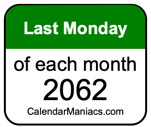 A list of last Mondays in each month of 2062 is not all we can do. Here you can generate another list.