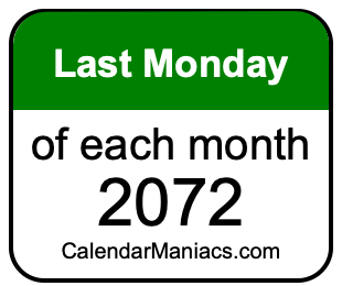 On top of that, for you calendar minimalists, we have also created a list of the last Mondays of each month in 2072 in the MM/DD/YY format, as you can see below:
