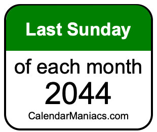 Do you need a list of the last Sundays of each month in 2044? You have come to the right place! We searched through the calendar for 2044 to find the last Sunday of each month in 2044. Here is the list of the last Sundays of each month in 2044 in the Weekday, Month, Day, Year format: