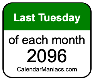 Do you need a list of the last Tuesdays of each month in 2096? You have come to the right place! We searched through the calendar for 2096 to find the last Tuesday of each month in 2096. Here is the list of the last Tuesdays of each month in 2096 in the Weekday, Month, Day, Year format: