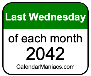 Do you need a list of the last Wednesdays of each month in 2042? You have come to the right place! We searched through the calendar for 2042 to find the last Wednesday of each month in 2042. Here is the list of the last Wednesdays of each month in 2042 in the Weekday, Month, Day, Year format: