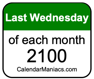 Do you need a list of the last Wednesdays of each month in 2100? You have come to the right place! We searched through the calendar for 2100 to find the last Wednesday of each month in 2100. Here is the list of the last Wednesdays of each month in 2100 in the Weekday, Month, Day, Year format:
