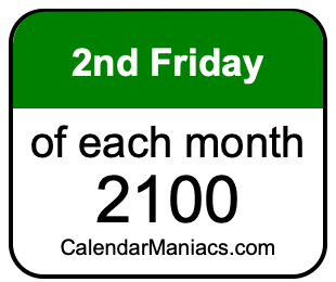 On top of that, for you calendar minimalists, we have also created a list of the 2nd Fridays of each month in 2100 in the MM/DD/YY format, as you can see below: