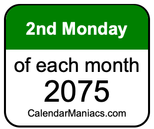 On top of that, for you calendar minimalists, we have also created a list of the 2nd Mondays of each month in 2075 in the MM/DD/YY format, as you can see below: