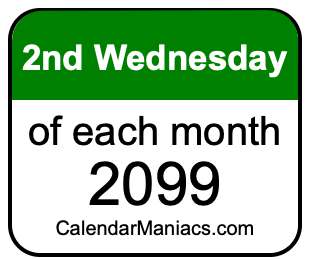 Do you need a list of the second Wednesdays of each month in 2099? You have come to the right place! We searched through the calendar for 2099 to find the 2nd Wednesday of each month in 2099. Here is the list of the second Wednesdays of each month in 2099 in the Weekday, Month, Day, Year format: