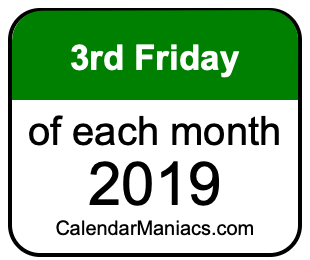 Any finally, for our visitors that use day before month in a date, here is a list of third Fridays in each month of 2019 in the DD/MM/YY format:
