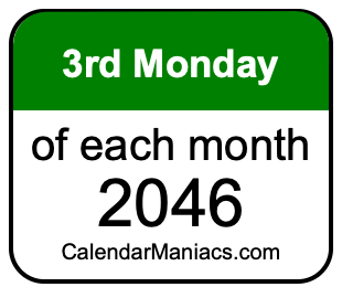 Do you need a list of the third Mondays of each month in 2046? You have come to the right place! We searched through the calendar for 2046 to find the 3rd Monday of each month in 2046. Here is the list of the third Mondays of each month in 2046 in the Weekday, Month, Day, Year format: