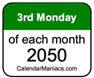 Do you need a list of the third Mondays of each month in 2050? You have come to the right place! We searched through the calendar for 2050 to find the 3rd Monday of each month in 2050. Here is the list of the third Mondays of each month in 2050 in the Weekday, Month, Day, Year format: