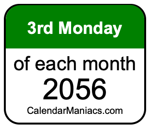 Do you need a list of the third Mondays of each month in 2056? You have come to the right place! We searched through the calendar for 2056 to find the 3rd Monday of each month in 2056. Here is the list of the third Mondays of each month in 2056 in the Weekday, Month, Day, Year format: