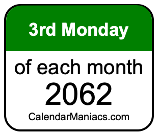 On top of that, for you calendar minimalists, we have also created a list of the 3rd Mondays of each month in 2062 in the MM/DD/YY format, as you can see below:
