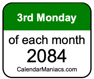 Do you need a list of the third Mondays of each month in 2084? You have come to the right place! We searched through the calendar for 2084 to find the 3rd Monday of each month in 2084. Here is the list of the third Mondays of each month in 2084 in the Weekday, Month, Day, Year format: