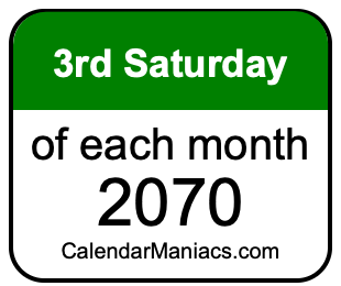 Do you need a list of the third Saturdays of each month in 2070? You have come to the right place! We searched through the calendar for 2070 to find the 3rd Saturday of each month in 2070. Here is the list of the third Saturdays of each month in 2070 in the Weekday, Month, Day, Year format: