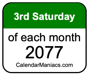Do you need a list of the third Saturdays of each month in 2077? You have come to the right place! We searched through the calendar for 2077 to find the 3rd Saturday of each month in 2077. Here is the list of the third Saturdays of each month in 2077 in the Weekday, Month, Day, Year format: