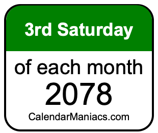 Do you need a list of the third Saturdays of each month in 2078? You have come to the right place! We searched through the calendar for 2078 to find the 3rd Saturday of each month in 2078. Here is the list of the third Saturdays of each month in 2078 in the Weekday, Month, Day, Year format: