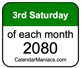 Do you need a list of the third Saturdays of each month in 2080? You have come to the right place! We searched through the calendar for 2080 to find the 3rd Saturday of each month in 2080. Here is the list of the third Saturdays of each month in 2080 in the Weekday, Month, Day, Year format: