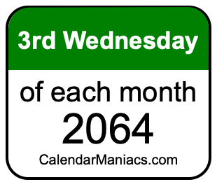 Do you need a list of the third Wednesdays of each month in 2064? You have come to the right place! We searched through the calendar for 2064 to find the 3rd Wednesday of each month in 2064. Here is the list of the third Wednesdays of each month in 2064 in the Weekday, Month, Day, Year format: