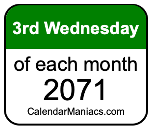 Do you need a list of the third Wednesdays of each month in 2071? You have come to the right place! We searched through the calendar for 2071 to find the 3rd Wednesday of each month in 2071. Here is the list of the third Wednesdays of each month in 2071 in the Weekday, Month, Day, Year format: