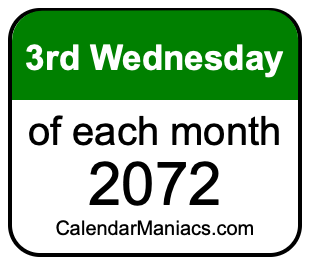 Do you need a list of the third Wednesdays of each month in 2072? You have come to the right place! We searched through the calendar for 2072 to find the 3rd Wednesday of each month in 2072. Here is the list of the third Wednesdays of each month in 2072 in the Weekday, Month, Day, Year format: