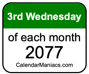 Do you need a list of the third Wednesdays of each month in 2077? You have come to the right place! We searched through the calendar for 2077 to find the 3rd Wednesday of each month in 2077. Here is the list of the third Wednesdays of each month in 2077 in the Weekday, Month, Day, Year format: