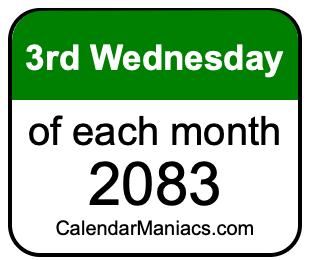 Do you need a list of the third Wednesdays of each month in 2083? You have come to the right place! We searched through the calendar for 2083 to find the 3rd Wednesday of each month in 2083. Here is the list of the third Wednesdays of each month in 2083 in the Weekday, Month, Day, Year format: