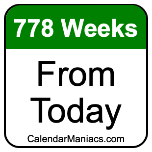 Note that there are many time zones, and the date 778 weeks from today depends on where you are. Therefore, when we calculated 778 weeks from today, we used the time and date from your computer or phone device.