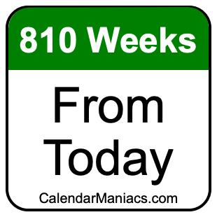 Note that there are many time zones, and the date 810 weeks from today depends on where you are. Therefore, when we calculated 810 weeks from today, we used the time and date from your computer or phone device.