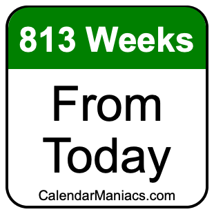 Note that there are many time zones, and the date 813 weeks from today depends on where you are. Therefore, when we calculated 813 weeks from today, we used the time and date from your computer or phone device.