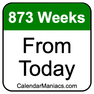 Note that there are many time zones, and the date 873 weeks from today depends on where you are. Therefore, when we calculated 873 weeks from today, we used the time and date from your computer or phone device.