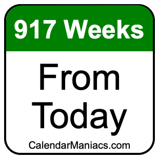 Note that there are many time zones, and the date 917 weeks from today depends on where you are. Therefore, when we calculated 917 weeks from today, we used the time and date from your computer or phone device.