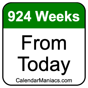 Note that there are many time zones, and the date 924 weeks from today depends on where you are. Therefore, when we calculated 924 weeks from today, we used the time and date from your computer or phone device.