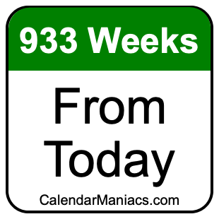 Note that there are many time zones, and the date 933 weeks from today depends on where you are. Therefore, when we calculated 933 weeks from today, we used the time and date from your computer or phone device.