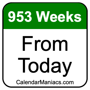 Note that there are many time zones, and the date 953 weeks from today depends on where you are. Therefore, when we calculated 953 weeks from today, we used the time and date from your computer or phone device.